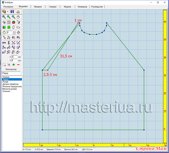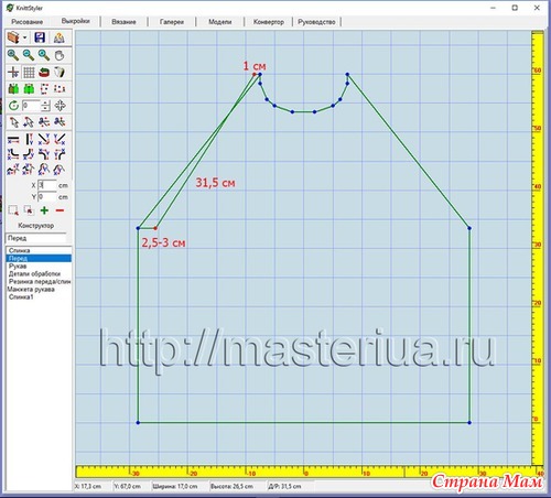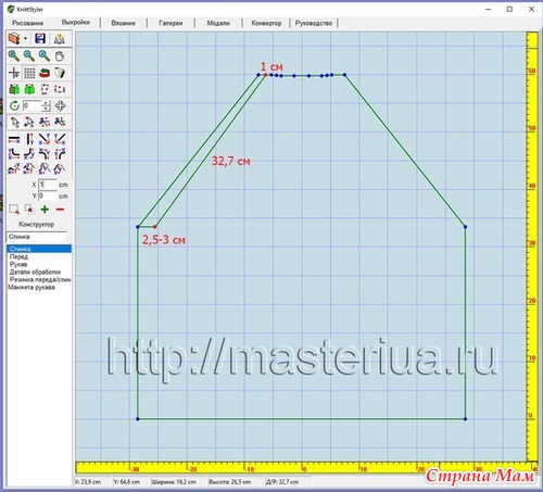 Я тоже делаю выкройку в Книттстайлере, но делаю выкройку в половинном размере. тогда у меня идут убавки по горловине, чего нет, если делать выкройку полную.