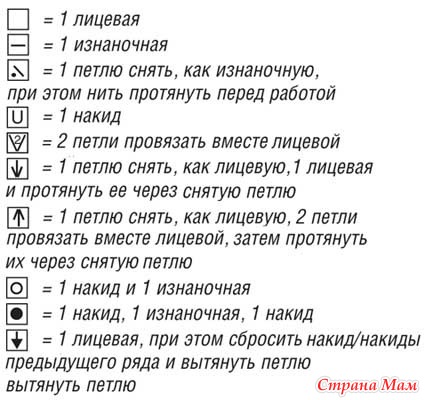 Вязать на нечетном числе петель согл. схеме. На ней даны лицевые и 1 изнаночный ряд. В неприведенных изнаночных рядах все петли провязывать изнаночными.