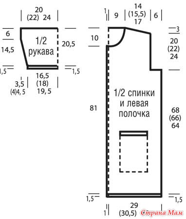 Для входа в карман через 33 см = 68 рядов от планки оставить внешние 11 (12) 13 п. и вязать по средним 17 п. для планки кармана 1,5 см платочной вязкой. Затем закрыть средние 17 п.
