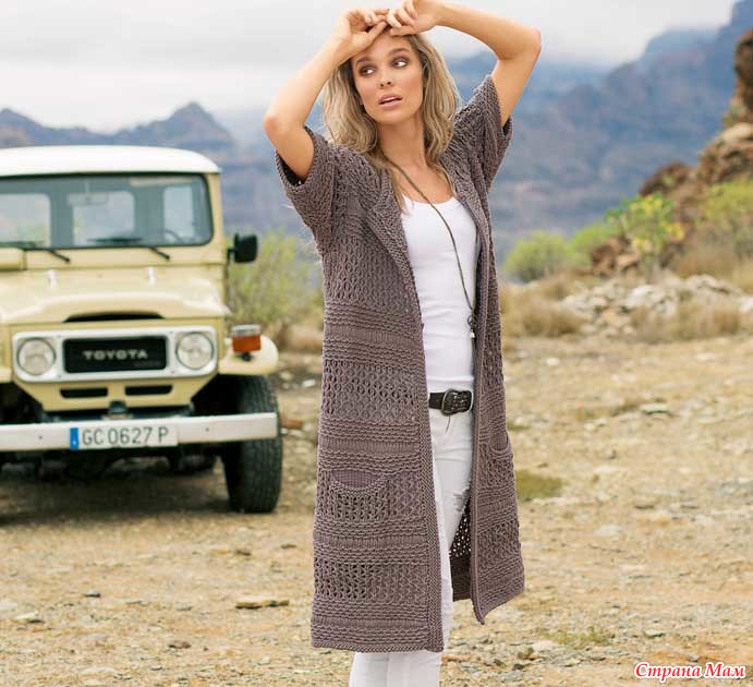 Стильное летнее пальто с коротким рукавом (впрочем, можно считать его кардиганом) из благородной пряжи подойдет и для отдыха, и для работы.