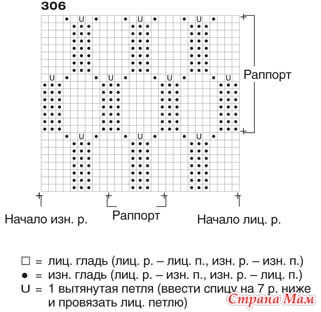 22 п. х 30 р. = 10 х 10 см, связано основным узором спицами № 3,5 (если плотность связанного образца не соответствует заданной, сменить спицы на более толстые (если плотность меньше указанной), или тонкие (если плотность больше указанной)).