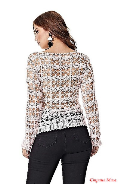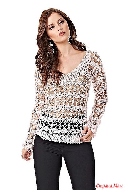 Этот пуловер вяжется красивым ажурным узором. Под него нужно одевать топ телесного или наоборот яркого альтернативного цвета чтобы подчеркнуть красоту узора.