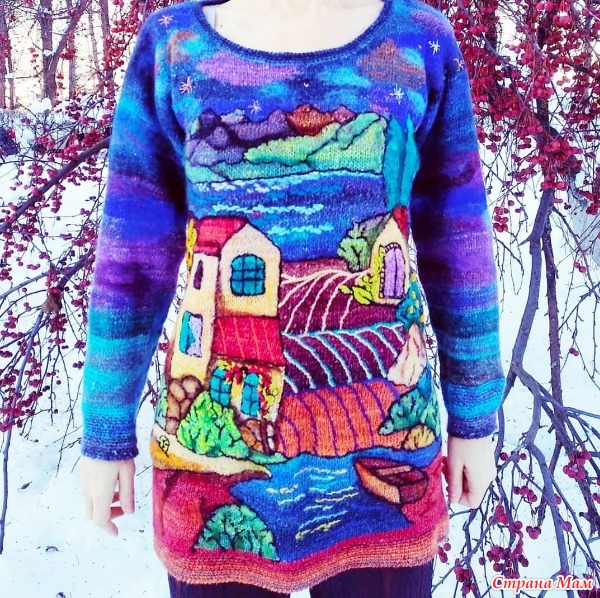 Добрый день, мастерицы и рукодельницы! В феврале закончила свою работу и вот он - результат моих трудов, бессонных ночей, взлетов и падений и полной эйфории: свитер "Как упоительны в России вечера". Выполнен из японской пряжи Noro Flower Bed. Ниточка интересная, с богатой палитрой цветов, не села и не вытянулась после стирки, даже ярче стало изделие. Достоинств у нее множество, а недостатков два: дорогая и сложно купить. Авторская работа, в единственном экземпляре, повтора не будет. Гораздо интереснее связать новую работу. Полностью ручная вязка. Связан в технике Интарсия. Никакого счета петель, схем и прочего, техника своеобразная, по своему эскизу. В работе также использовались вышивка и сухое валяние. Размер 42 - 44, длина 75 см. ОТ ДУШИ БЛАГОДАРЮ ВСЕХ НЕРАВНОДУШНЫХ!!! УСПЕХОВ В ТВОРЧЕСТВЕ ВАМ, КУДЕСНИЦЫ!!!