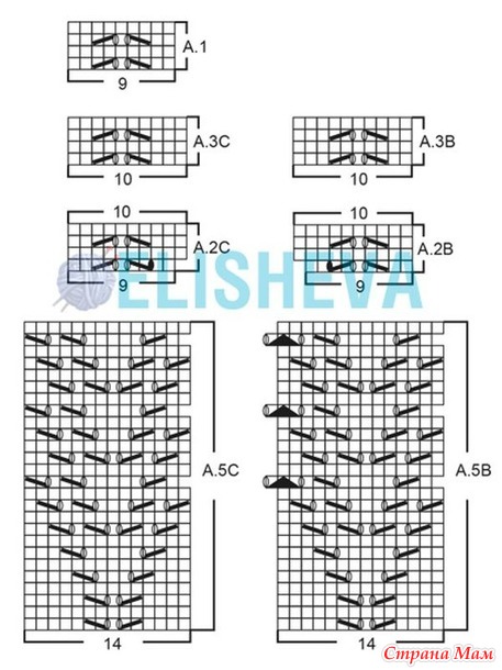 В описании приведены узоры для вязки жакета, они показаны для всех рядов, вид с лицевой стороны. Основных схем 6, А.1 – А.6, имеются разновидности узоров. В них названия схем дополнены буквами А, В и С.