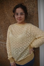 Связалась кофточка с втачным рукавом для себя. Размер у меня скромный 54-56. А на фото позирует дочь (размер большеватый для нее). Изделие выполнено из слонимской полушерсти в 3 сложения. Имитация резинки - переплетение велле, использована шелковистая нить "фризе" (турецкая) в 1 сложение и полушерсть в 2 сложения. Узор взят из памяти машины Брайзер 940. Вязать с отрегулированной кареткой одно удовольствие.