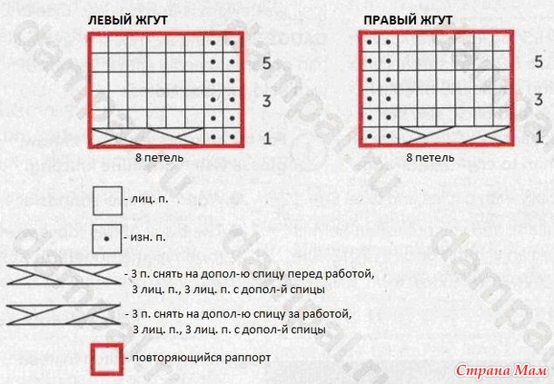 При недостаточном количестве петель для выполнения жгута на 6-ти петлях, эти петли провязывать лицевой гладью вместо жгута.
