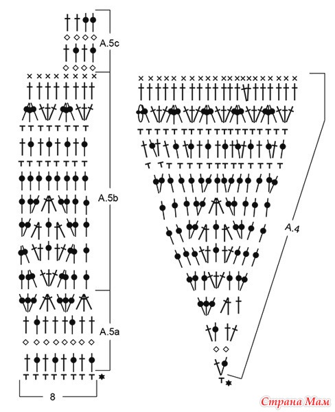 Когда провяжете по 1 вертикальному раппорту схем A.5a и A.3, следующий лиц. ряд вяжите по схеме: