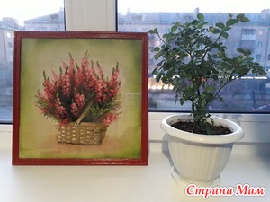 Работа оформлена в вишневую раму, канва подкрашена акварельными карандашами. Пока не решила, будет ли "Вереск" подарен или останется дома.