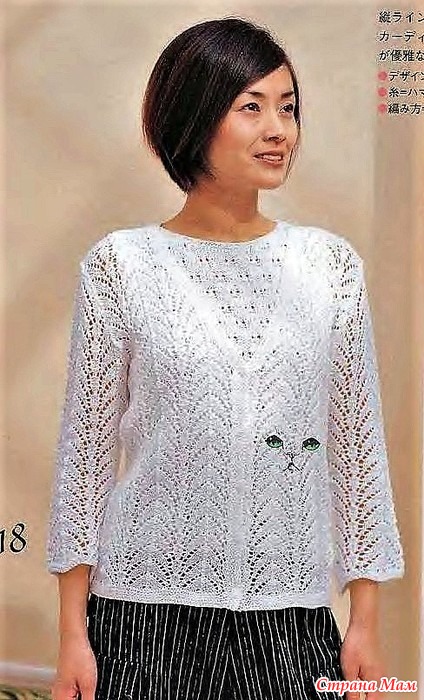 Заинтересовал ажур жакета и по низу топа. Но так и не смогла своими силами понять как его вывязывать За счет чего получаются наклоны петель к центру? Если провязывать по две вместе, то не хватает накидов... Может быть кто-нибудь разберется и подскажет.