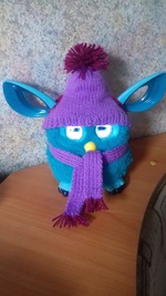 И вот спустя какое-то время дочь стала приставать ко мне:Мама, свяжи Фёрбику шапку и шарф! Я долго отнекивалась и вот мои девочки поехали отдыхать в санаторий. Они впервые уехали одни, без меня. Вообщем, я так соскучилась, что решила сделать дочери приятный сюрприз. Пол денёчка прокопалась и вуаля!