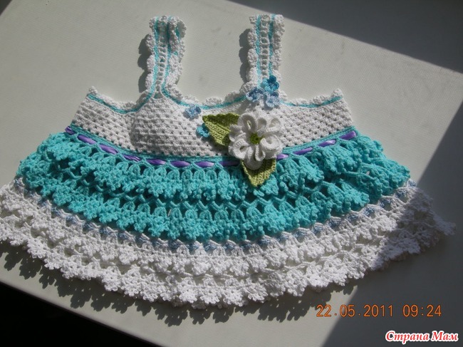 Понрaвился мне топ незабудки, но подходящих ниточек не было, а до магазина некогда было бежать, поэтому, как говориться, я его слепила из того, что было... И еще хотелось связать для своей кнопки именно топик, а не платье, в связи с чем укоротила количество рядов снизу.