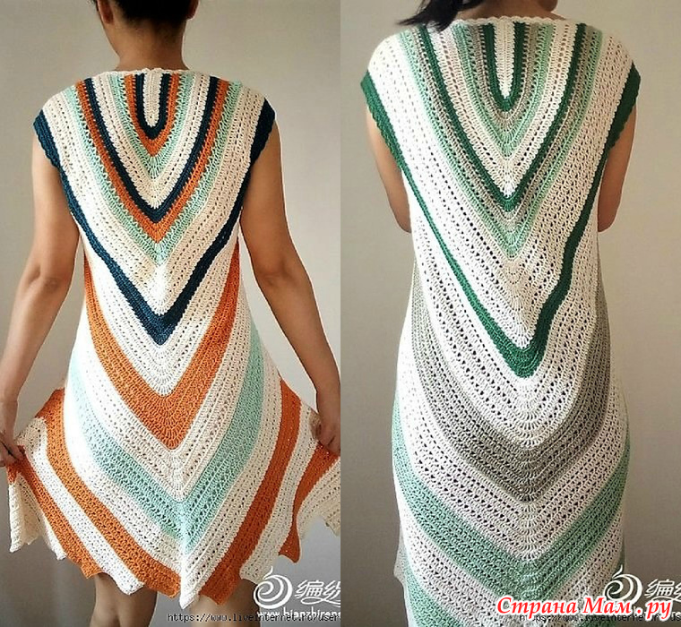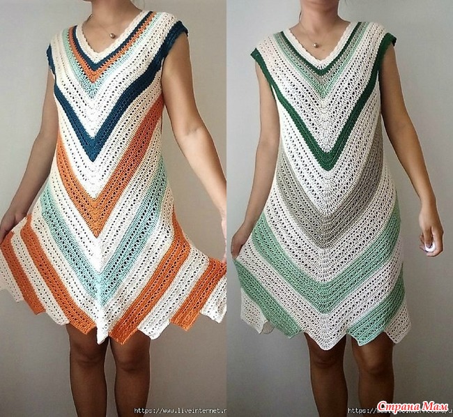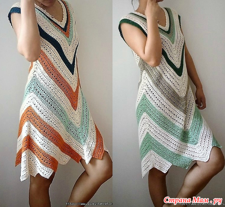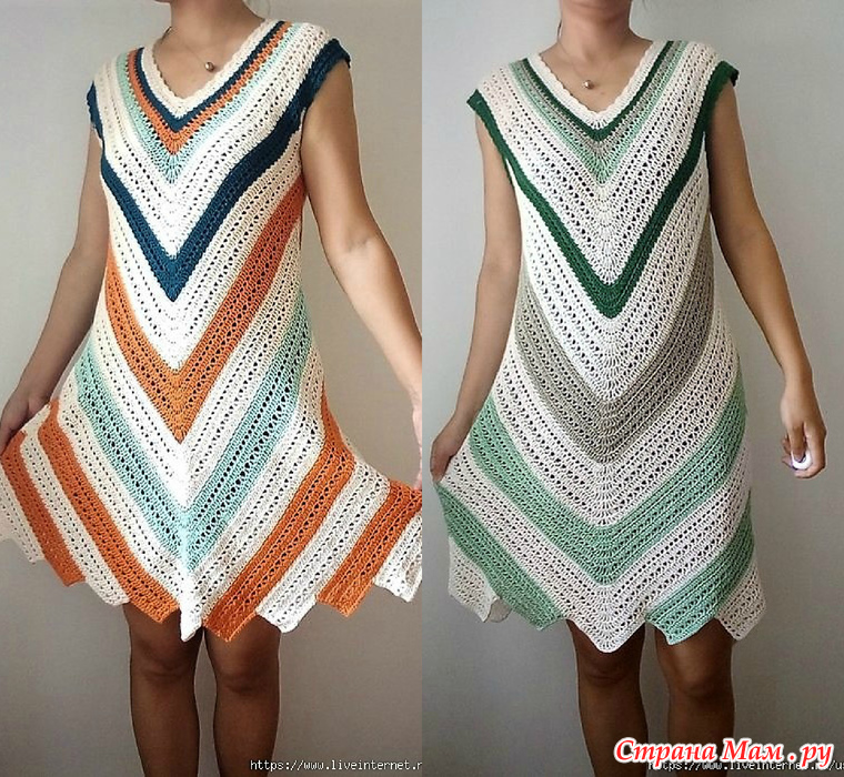 Это симпатичное платье связано от горловины диагональным узором в полоску. Этот узор очень стройнит фигуру. Здесь представленны два цветовых варианта.