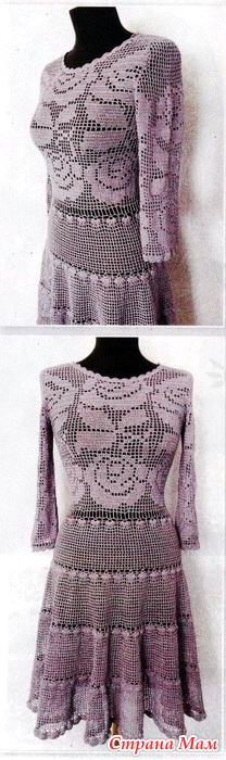 Роза и сирень слилисть в бемподобный букет в этом платье. Верх красиво облегающий фигуру украшают филейные розы а расклешенная юбка ложиться красивыми воланами