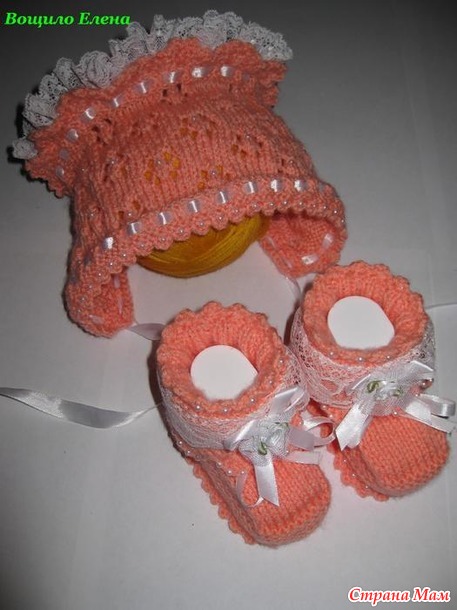 Связался вот такой комплектик на выписку к персиковому костюмчику. Пряжа Бэби. Бусинки все ввязаны, так что не оторвутся. Кружево пришивала вручную и сразу присборивала.