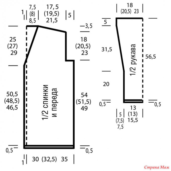 Через 54 см = 124 ряда (51,5 см = 118 рядов) 49 см = 112 рядов от планки закрыть для пройм с обеих сторон 1 x 8 п. = 83 (91) 99 п.