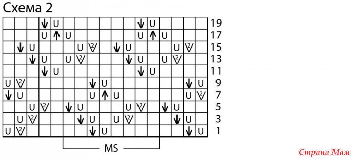 Число петель кратно 8 + 1 + 2 кромочные = вязать согл. схеме 2. На ней даны лицевые ряды. В изнаночных рядах все петли и накиды провязывать изнаночными. Начать с 1 кром. и петель перед раппортом, раппорт постоянно повторять, закончить петлями после раппорта и 1 кром. Постоянно повторять 1—20-й ряды.