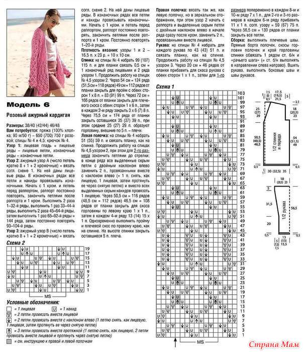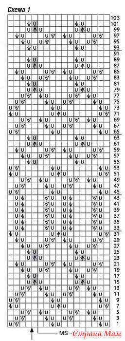 Число петель кратно 8 + 1 + 2 кромочные = вязать согл. схеме 1. На ней даны лицевые ряды. В изнаночных рядах все петли и накиды провязывать изнаночными. Начать с 1 кром. и петель перед раппортом, раппорт постоянно повторять, закончить петлями после раппорта и 1 кром. Выполнить 2 раза 1—32-й ряды, выполнить 1 раз 33—44-й ряды, выполнить 2 раза 45—64-й ряды, затем выполнить 1 раз 65—92-й ряды = 144 ряда, затем постоянно повторять 93—104-й ряды.