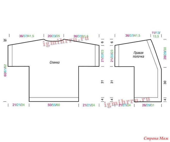 набрать 82/90/98 п. и в следующем изн. р. провязать все петли лиц. Затем вязать жемчужным узором. Через 4 см от наборного края продолжить работу ажурным узором, при этом между обеими кром. повторить 20 х/22 х/24 х раппорт из 4 п. Связать таким образом 78 р. (= около 31 см). Для правого рукава в конце 78-го р. (= изн. р.) ажурного узора заново набрать 34/34/38 п. = 116/124/136 п. Планка рукава выполняется жемчужным узором, поэтому в следующем лиц. р. распределить петли таким образом: кром., 5 п. провязать жемчужным узором (при этом начать с 1 изн.), затем выполнять ажурный узор, начиная с 1 п. перед раппортом, повторить 27 х/29 х/32 х раппорт из 4 п., оставшуюся последнюю петлю провязать лиц. Теперь для левого рукава дополнительно набрать 34/34/38 п. = 150/158/174 п. В следующем изн. р. распределить петли таким образом: кром., 5 п. провязать жемчужным узором (при этом начать с 1 лиц.), затем продолжать выполнять ажурный узор, начиная с 1 изн. (= в следующем лиц. р. 1 п. после раппорта), повторить 34 х/36 х/40 х раппорт из 4 п. и оставшиеся 7 п. вязать, как прежде. На высоте 21/22/23 см от начала прибавления петель для рукавов закрыть для скосов плеча с обеих сторон 1 х 7/7/8 п., затем в каждом 2-м р. 4 х 7 п. и 3 х 8 п./2 х 7 п. и 5 х 8 п./4 х 8 п. и 3 х 9 п. = 32/36/40 п. Через 60/61/62 см от наборного края закрыть для выреза горловины средние 20/24/28 п. и обе стороны закончить раздельно. Для закругления закрыть с внутреннего края выреза в каждом 2-м р. ещё 2 х 3 п. Общая высота спинки = 62/63/64 см.