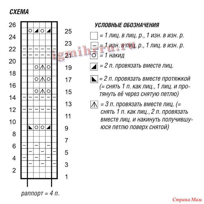 Левая полочка: вязать симметрично правой полочке, при этом для убавлений скоса горловины провязывать 2 п. вместе лиц.