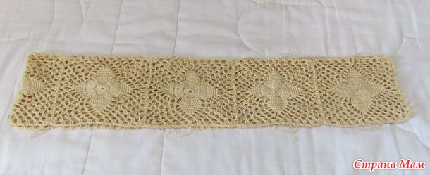 Начала вязать с мотивов, связала ленту из 8, примерила на бедрах, получилось впритык, добавила еще один на свободу облигания.