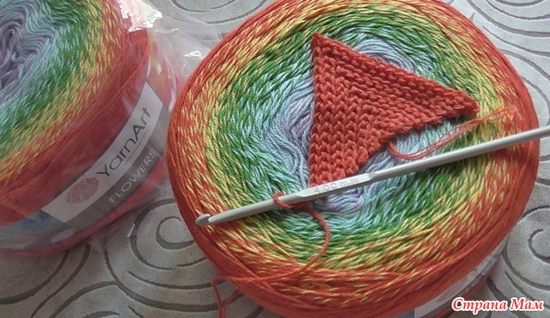 Нитка понравилась. Начала вязать образец треугольником крючком 4мм и не смогла остановиться