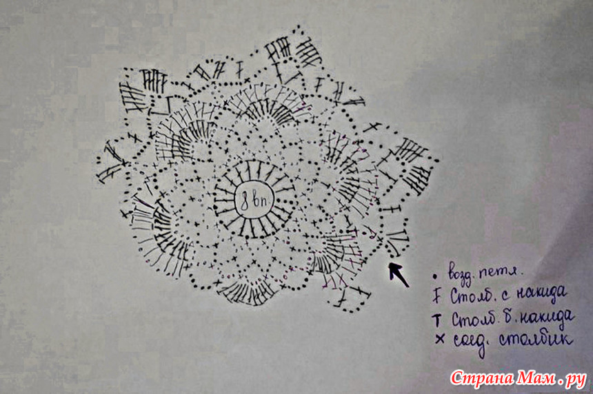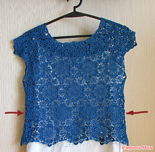 Стрелками указан ряд мотивов для приталивания, в центре в мотивах пропущен ряд цепочки из 4 воздушных петель, и в арке вместо 11 столбиков с накидом 9.