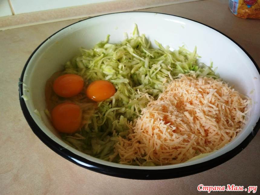Затем натираем кабачки на крупной терке, даем немного постоять, чтобы они пустили сок и очень хорошо отжимаем. Соли, перчим, добавляем тертый сыр и яйца. Все хорошо перемешиваем и только потом добавляем 2 жмени муки. Снова все перемешиваем.