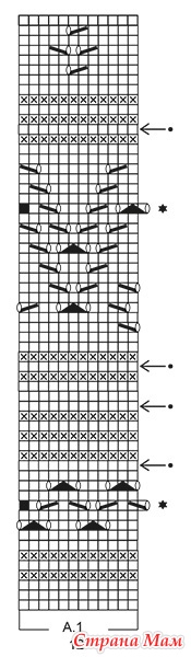 Провязать 4 круга платочным узором, перейти на спицы 4 мм. Продолжить по схеме А.1 на всех петлях по кругу, при этом в 11 и 41 кругах переместить начало круга на 1 петлю. В кругах отмеченных стрелками вязать равномерные прибавления: