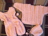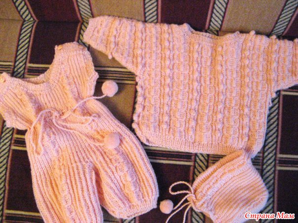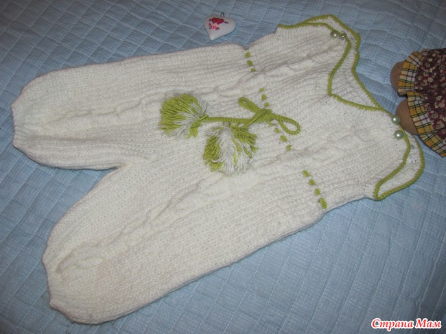 Комбинезон: для каждой половинки комбинезона набрать на спицы 43 п. и кромочные петли (18 см) для нижнего края и вязать резинкой 8 р. (2 см). Затем продолжить вязание, распределив петли узоров в следующей последовательности: 18 п. широкой полупатентной резинки, 14 п. «косы», 37 п. широкой полупатентной резинки, 14 п. «косы», 18 п. широкой полупатентной резинки. При этом в 1-м р. на участках широкой полупатентной резинки вывязывать из протяжек по 2 п. изнаночными скрещенными.