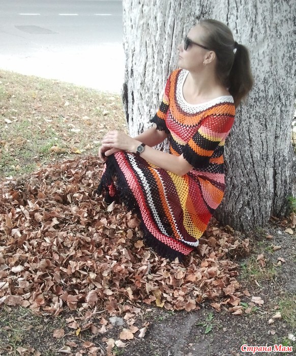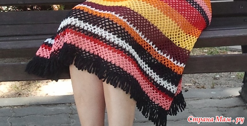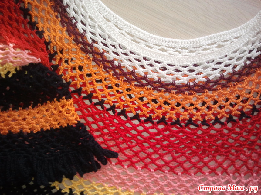 Связала быстро, с желанием, цвета пряжи все были дома, ничего не покупалось специально. Я не очень люблю яркие цвета, а тут прямо захотелось как на картинке, такой взрыв цветов))))))) Длину сделала комфортную для себя. и вместо бахромы висюльки из 30 воздушных петель.