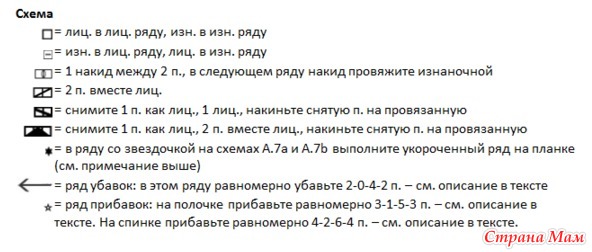 При выполнении узора A.7a в правой части полочки провяжите укороченный ряд: провяжите все петли, поверните и провяжите 4 п. планки лицевыми, поверните, провяжите 4 п. планки лицевыми, поверните и провяжите все петли.