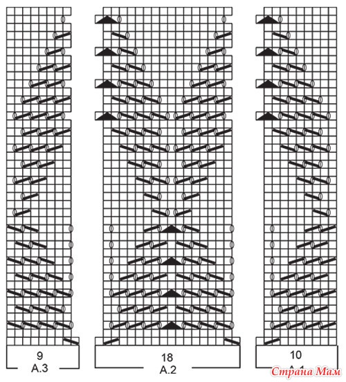 Наберите 99-117-135-153 п. на круговые спицы № 5 мм и провяжите 2 платочных ряда. Далее вяжите по схеме: 4 п. платочной вязкой, узор A.1 (= 10 п.), узор A.2 (= 18 п.) 4-5-6-7 раз в ширину, A.3 (= 9 п.), 4 п. платочной вязкой. Когда провяжете первый ряд схем A.1-A.3, у вас будет 89-105-121-137 п. Когда провяжете полный раппорт схем A.1-A.3, продолжайте вязать лицевой гладью, 4 п. с каждого края вяжите платочной вязкой. Когда длина детали составит 26-28-30-32 см, продолжайте вязать следующим образом, в первом ряду равномерно убавляя 2-0-4-2 п.: 4 п. платочной вязкой, вяжите по схеме A.4, пока не останется 5 п., провяжие первую п. со схемы A.4, 4 п. платочной вязкой = 87-105-117-135 п. В предпоследнем ряду схемы A.4 равномерно убавьте 3-1-5-3 п. (не делайте убавок среди петель платочной вязки) = 90-106-122-138 п. Последний ряд – изнаночный: провяжите первые 45-53-61-69 п. и перенесите их на вспом. нить (правая часть полочки). Продолжайте вязать оставшиеся 45-53-61-69 п. (= левая часть полочки).