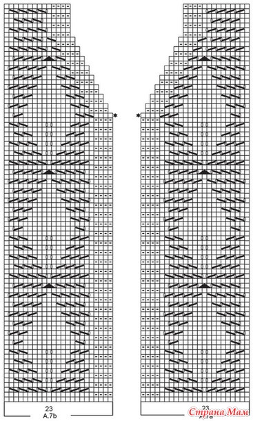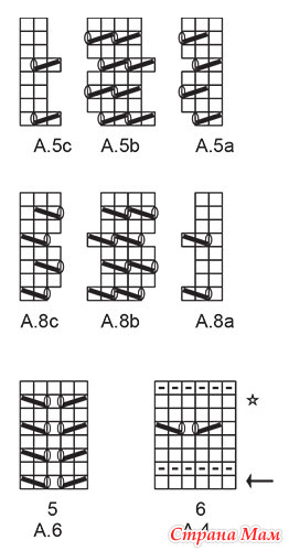 = 45-53-61-69 п. Закрепите маркер и от него измеряйте длину вязания. Вяжите с лиц. ряда: 4 п. платочной вязкой, узор A.5a (= 2 п.), следующие 8-16-24-32 провяжите по схеме A.5b (= 4 п.), узор A.5c (= 3 п.), A.6 (= 5 п.), A.7a (= 23 п.s). Продолжайте вязать по этой схеме. Через 10-10-8-8 см наберите в конце следующего изн. ряда 8 петель = 53-61-69-77 п. Следующий лиц. ряд: 4 п. платочной вязкой, узор A.5a, следующие 16-24-32-40 п. провяжите по схеме A.5b, продолжайте вязать по схемам A.5c, A.6 и A.7a. В ряду со звездочкой на схеме A.7a провяжите укороченный ряд (см. примечание выше). Когда провяжете полный вертикальный раппорт узора A.7a, у вас будет 44-52-60-68 п. для плеча, высота полочки будет ок. 38 см. Провяжите 1 платочный ряд и свободно закройте петли. Длина полочки от линии плеч – ок. 68-70-72-74 см.