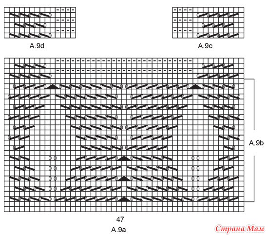 Далее вяжите по схеме: 4 п. платочной вязкой, узор A.5a (= 2 п.), следующие 8-16-24-32 п. вяжите по схеме A.5b (= 4 п.), узор A.5c (= 3 п.), A.6 (= 5 п.), A.9a (= 47 п.), A.6 (= 5 п.), A.8a (= 3 п.), следующие 8-16-24-32 п. вяжите по схеме A.8b (= 4 п.), A.8c (= 2 п.), 4 п. платочной вязкой.