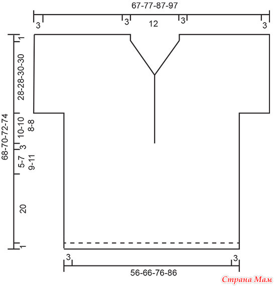 Все части туники вяжутся раздельно поворотными рядами и затем сшиваются вместе.