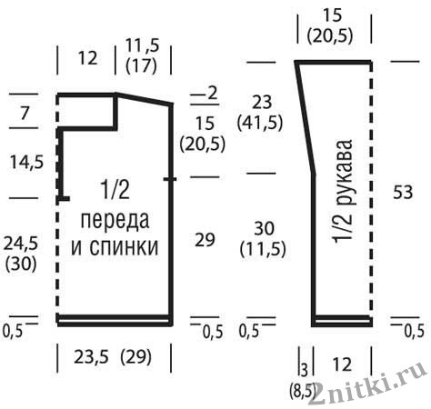 Вязать, как спинку, но для разреза горловины через 24,5 см = 64 ряда (30 см = 78 рядов) от планки разделить работу посередине и обе стороны закончить раздельно.