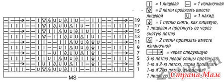 Вязать согл. схеме. На ней даны лицевые ряды. В изнаночных рядах петли провязывать по рисунку, накиды изнаночными. Из двух накидов подряд первый провязывать лицевой, второй – изнаночной.