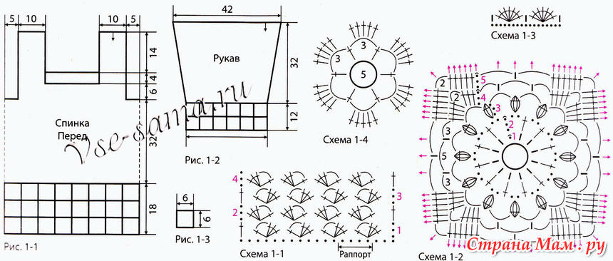 Размеры, направление вязания и расположение элементов указано на выкройке (рис. 1-1, рис. 1-2).