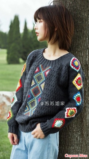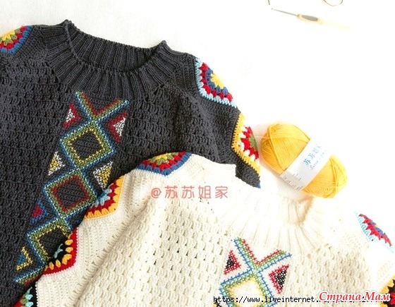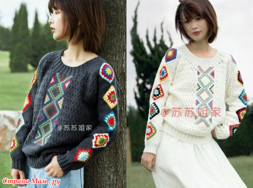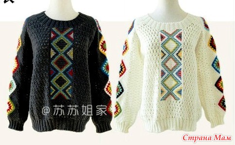 Эти джемперы\реглан с вставками из цветных мотивов (которые напоминают бабушкин квадрат )по переду и рукавам смотрятся очень стильно и молодежно.