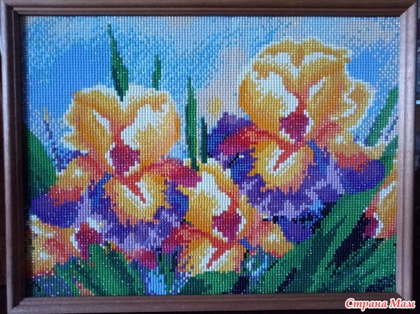 Ирисы. Эта поменьше 30*40. Живёт у нас.Есть ещё павлин,размер 80"40 ,но его фотографии только в цифровике. Всем спасибо за просмотр.