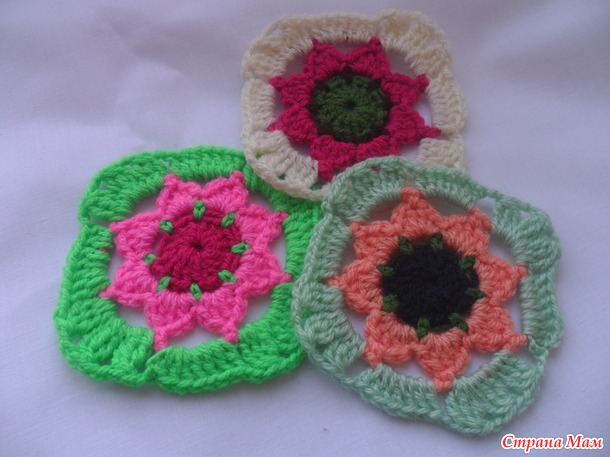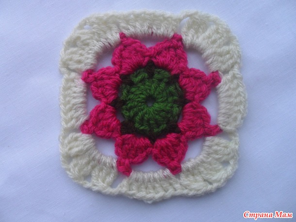 Размер мотива у всех будет разный. Он зависит от пряжи,размера крючка и плотности вашего вязания.Кончики ниточек прячем в процессе вязания, экономит время и нервы)))После каждого ряда пересчитываем столбики, арочки и т.д. Это очень важно, если не хотите перевязывать мотив.
