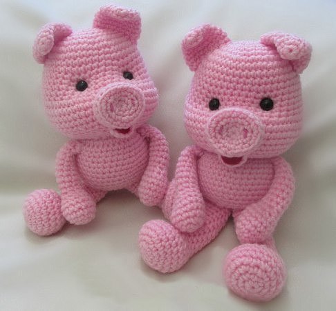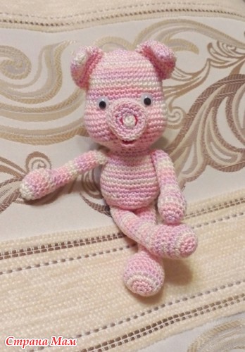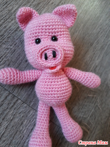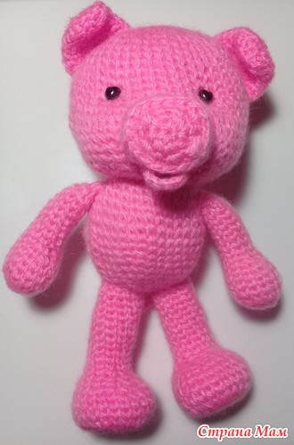 Ноги одной стороной пришить к стопам, другой к туловищу! Надеваем платье на туловище и вместе с ним пришиваем к голове. Собрать Пеппу. На месте глаз сначала сделать утяжки, потом пришивать глазки. Пятачок за свободные полупетли обвязать розовым цветом (темнее, чем тело)!