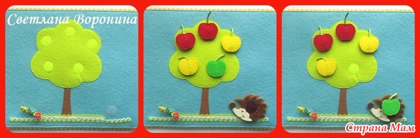 4 страница - яблоня с яблоками разного цвета. Крепятся к яблоне на липучку.
