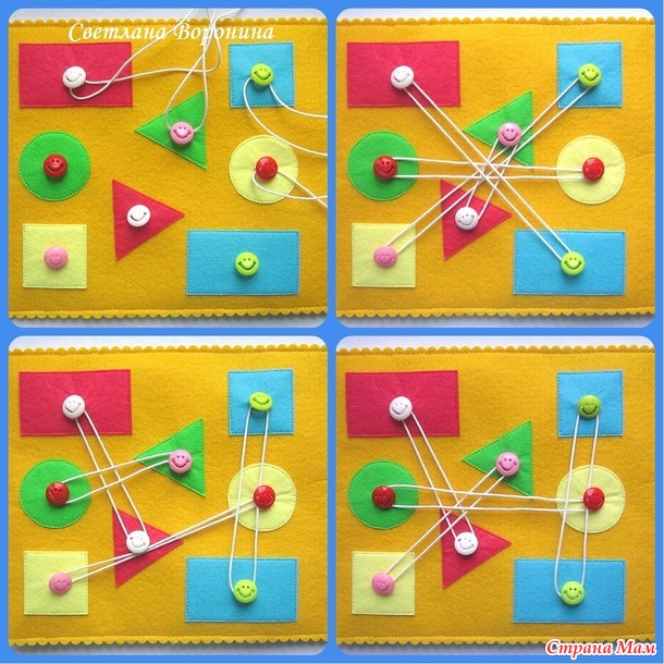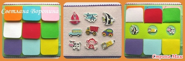 Пока ребенок маленький, он с удовольствием играет с элементами на липучке. Очень малыши любят с треском отдирать их от страницы. С радостью ребенок будет находить знакомые предметы; искать тех, кто спрятался; заниматься перетяжками. Ребенок растет, и вы постепенно знакомите с цветом, фигурами, размером, расположением в пространстве, со счетом. В каком порядке это делать, решаете вы сами. В процессе игры ребенок осваивает застежки, что очень пригодится ему в детском саду.