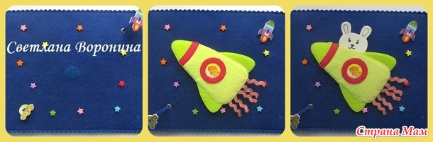 К странице на липучку крепится ракета.Она сделана в виде кармана. Туда можно посадить маленькую игрушку. У нас это зайчик из фоамирана.