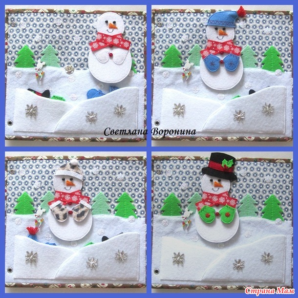 2 страница - Снеговик. Он крепится к странице на кнопку. В сугробы-карманы спрятаны головные уборы и рукавички. В руки Снеговика и в рукавички вшиты магниты.