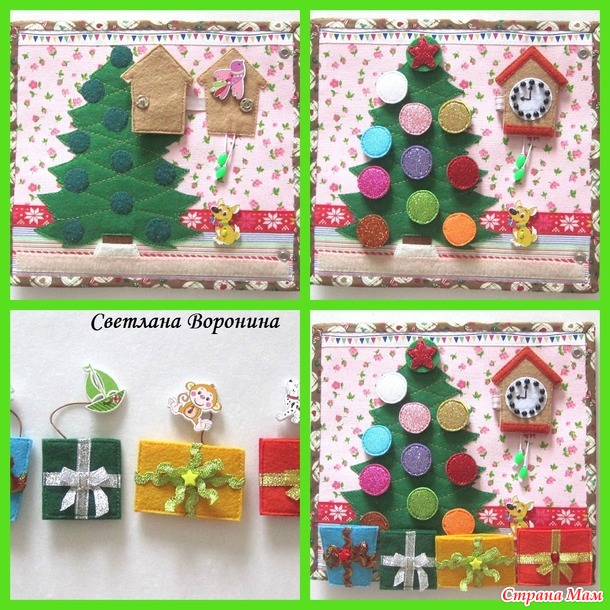 3 страница - наряжаем елку. Разноцветные блестящие шарики на елку и подарки под елку крепятся на липучку. Внутри подарков спрятаны декоративные пуговицы. Часы закрываются на кнопку, внутри сидит птичка.