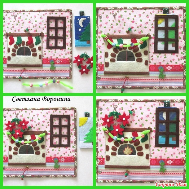 4 страница - продолжаем подготовку к Новому году или Рождеству. Венок с бубенчиком вешаем на крючок. Гирлянда к камину - синельная проволока с бусинами. Вставка в окно изображает один и тот же пейзаж: с одной стороны день, а с другой ночь. Пламя в камине на перетяжке.