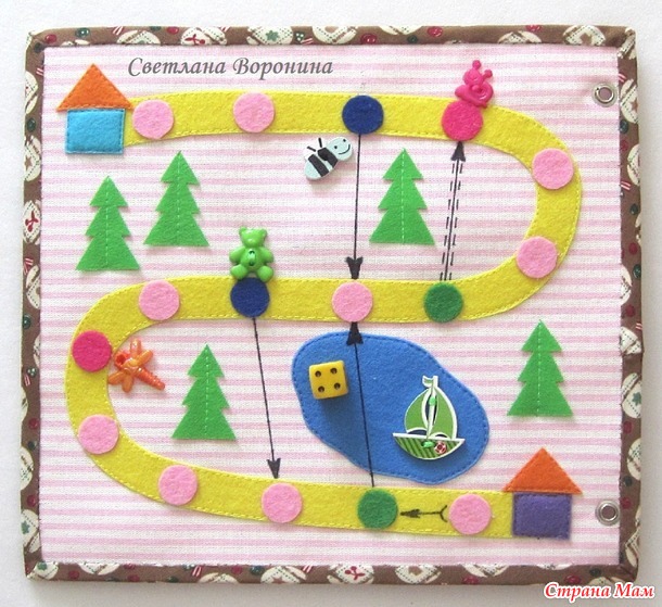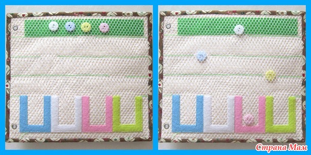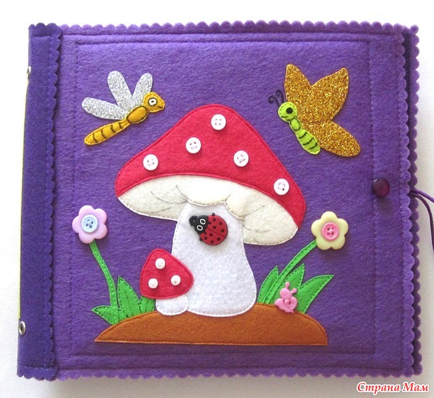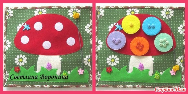 6 страница - цвета, счет до 5. Кружочки с нашитыми пуговками крепятся к шляпке гриба на липучку. Бабочка передвигается по шнуру вверх-вниз.