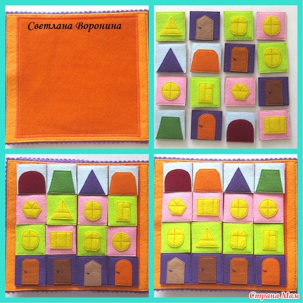 1 страница - строим большой дом. На страницу нашита велкроткань (аналог мягкой части ленты-липучки. 16 квадратов из фетра: на одной стороне каждого квадрата изображение крыши, двери, окна. С обратной стороны - жесткая часть липучки.